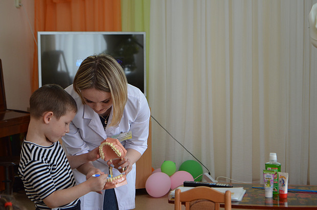 В ходе профилактической акции в детском доме «Надежда» стоматологи рассказали ребятам сказку о вреде большого количества сладостей, о необходимости правильно ухаживать за зубами. Дети активно принимали участие в обсуждении полезных и вредных для здоровья зубов продуктов, посмотрели мультфильм о «Зубных защитниках», рассказали о своих новых знаниях, потренировались в технике правильной чистки зубов, а в завершение мероприятия получили зелёные яблоки – символ здоровья зубов.