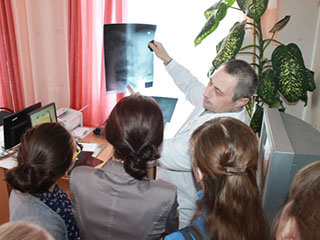 С ознакомительной экскурсией школьники посетили хирургическое отделение, флюорографический кабинет, где им были продемонстрированы снимки легких в норме и при патологии. Также они познакомились с работой врача-оториноларинголога ЦРБ. Татьяна Метелёва рассказала о возможностях нового аппарата, определяющего функциональное состояние внутреннего уха, коротко рассказала о своей профессии и пожелала девушкам успехов и дальнейшего возвращения в Унинскую ЦРБ уже в качестве ее сотрудников.