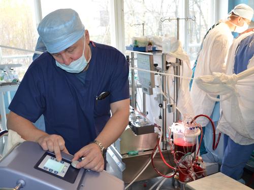 Врач-анестезиолог-реаниматолог отделения анестезиологии-реанимации №2 КОКБ И.Н.Чичерин за работой. На заднем плане - операция протезирования аортального клапана, аппарат искусственного кровообращения.