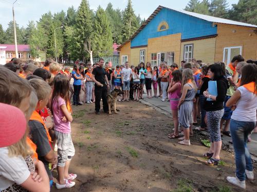 Мероприятие в лагере "Юность". Перед ребятами выступает кинолог управления УФСКН со служебной собакой.